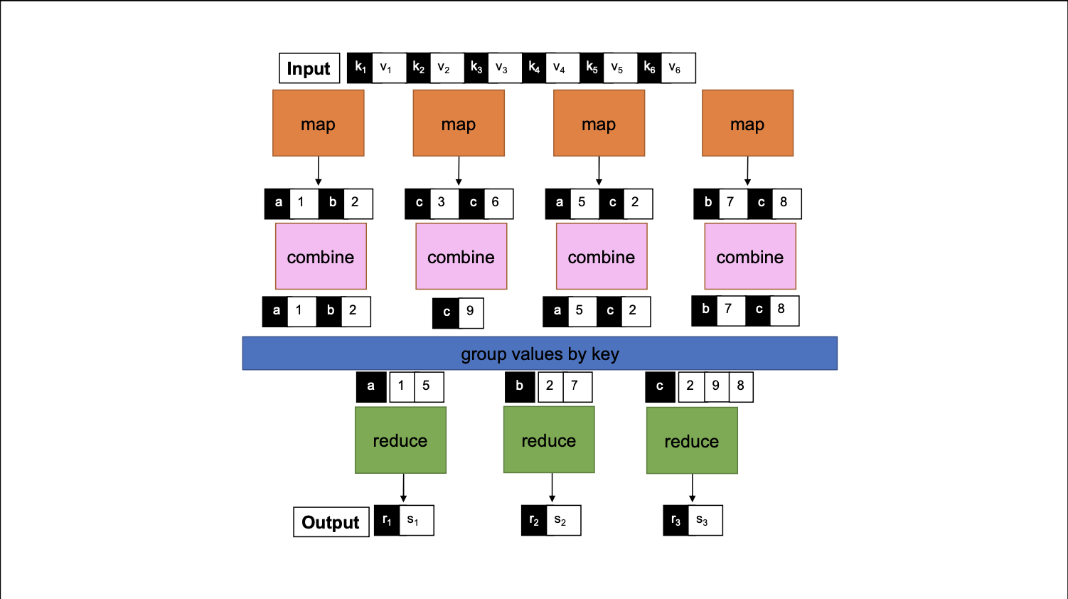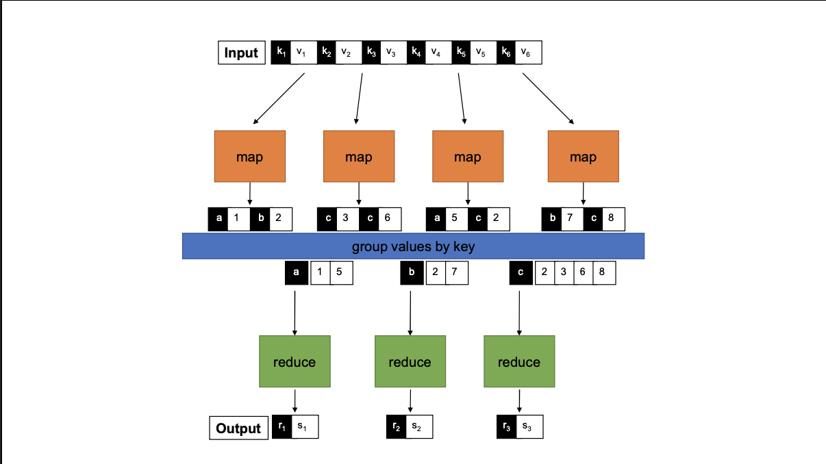 map: (k1,v1) => List[(k2, v2)]reduce: (k2, List[v2]) => List[(k3, v3)]